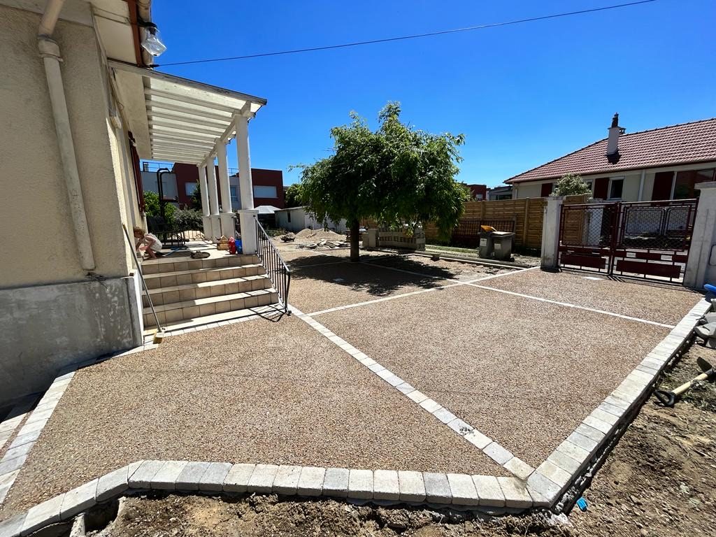 Pour ce projet dans le Val-d’Oise, nous avons métamorphosé une entrée de maison en remplaçant un sol irrégulier par un tapis de pierre esthétique et drainant.